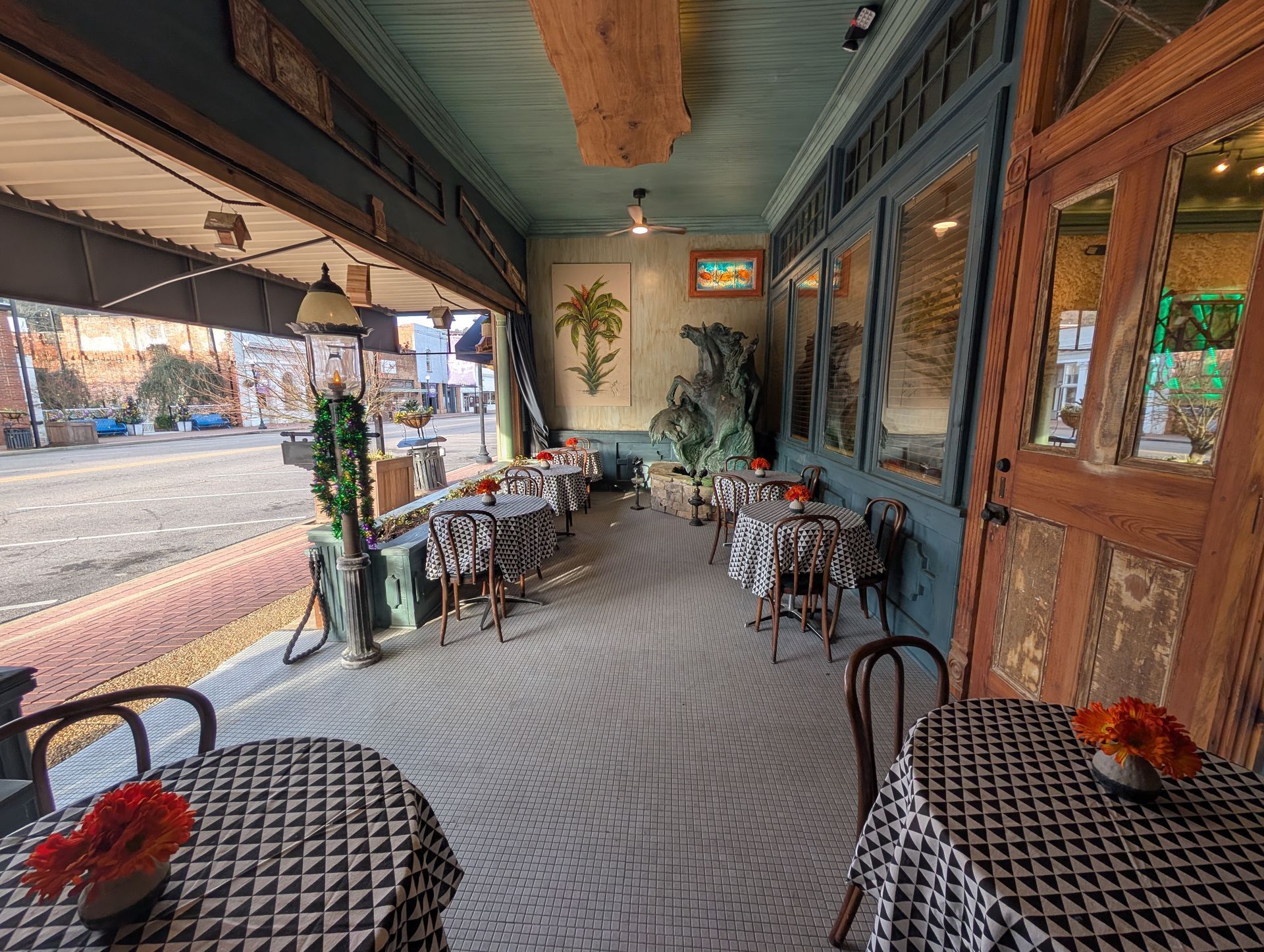 The Cypress Room front porch boasts a charming open-air covered seating area enhanced by a stunning water feature.